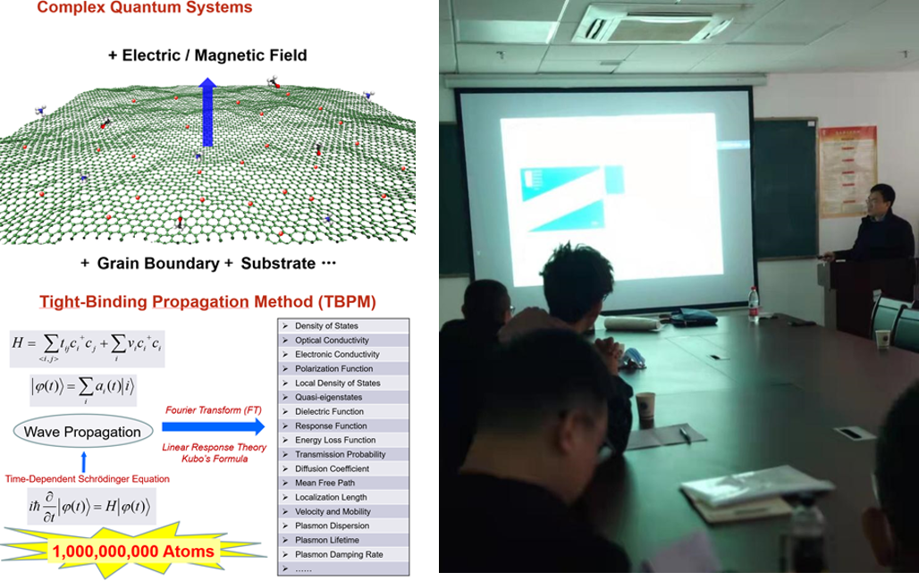 在本次报告中,袁声军教授以褶皱起伏的石墨烯、莫尔超晶格、非整数空间维度的分形结构、没有空间平移对称性的准晶为例引出复杂量子体系。在量子力学中,解决问题的常见方法通常是从寻找时间无关的Schrödinger方程的解开始的。由哈密顿矩阵对角化得到的本征函数可以得到可观测量或物理性质。然而,由于对角化过程中的内存成本和CPU时间与哈密顿矩阵的维数不是线性相关的,这种方法对于复杂的量子系统是不适用的。为了解决这个问题,袁声军教授介绍了紧束缚传播方法(TBPM)来模拟复杂的量子系统,TBPM基于含时Schrödinger方程的数值解,不需要对体系对角化,计算成本和系统复杂度线性相关。在此基础上,袁声军教授详细介绍了团队应用该方法发现了多层扭转石墨烯中的赝磁场,建立了准晶的有效能带结构,研究了分形结构中电子态的局域情况,以及探索了自旋多体系统和通用量子计算机的模拟。最后,袁声军教授还展示了如何结合TBPM与其他著名的数值方法,如密度泛函理论和分子动力学。 袁声军教授对TBPM的探究解析过程讲解细腻、通俗易懂。师生们对报告内容十分感兴趣,积极提问。袁声军教授对大家的问题都一一进行了详细的解答,并做了相关知识点的拓展,师生们均受益匪浅。学术报告会圆满结束。