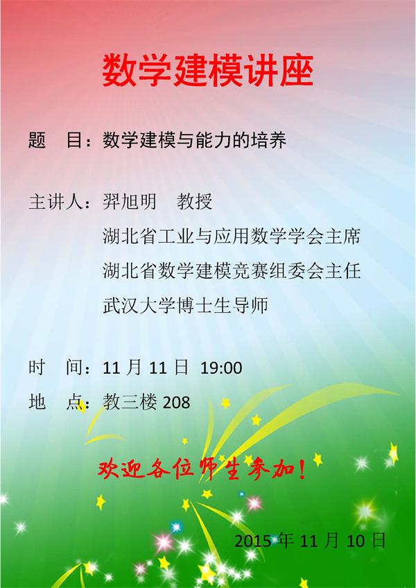 应大学数学部杨瑞琰教授的邀请,武汉大学博士生导师羿旭明教授将于11月11日19:00在我校教三楼208教室做数学建模方面的专题报告。羿旭明教授长期参与全国大学生数学建模竞赛湖北赛区的领导和评卷工作,具有丰富的数学建模指导经验,他本次报告的题目是“数学建模与能力的培养”,热烈欢迎Betvictor中文版全体师生前往参加!