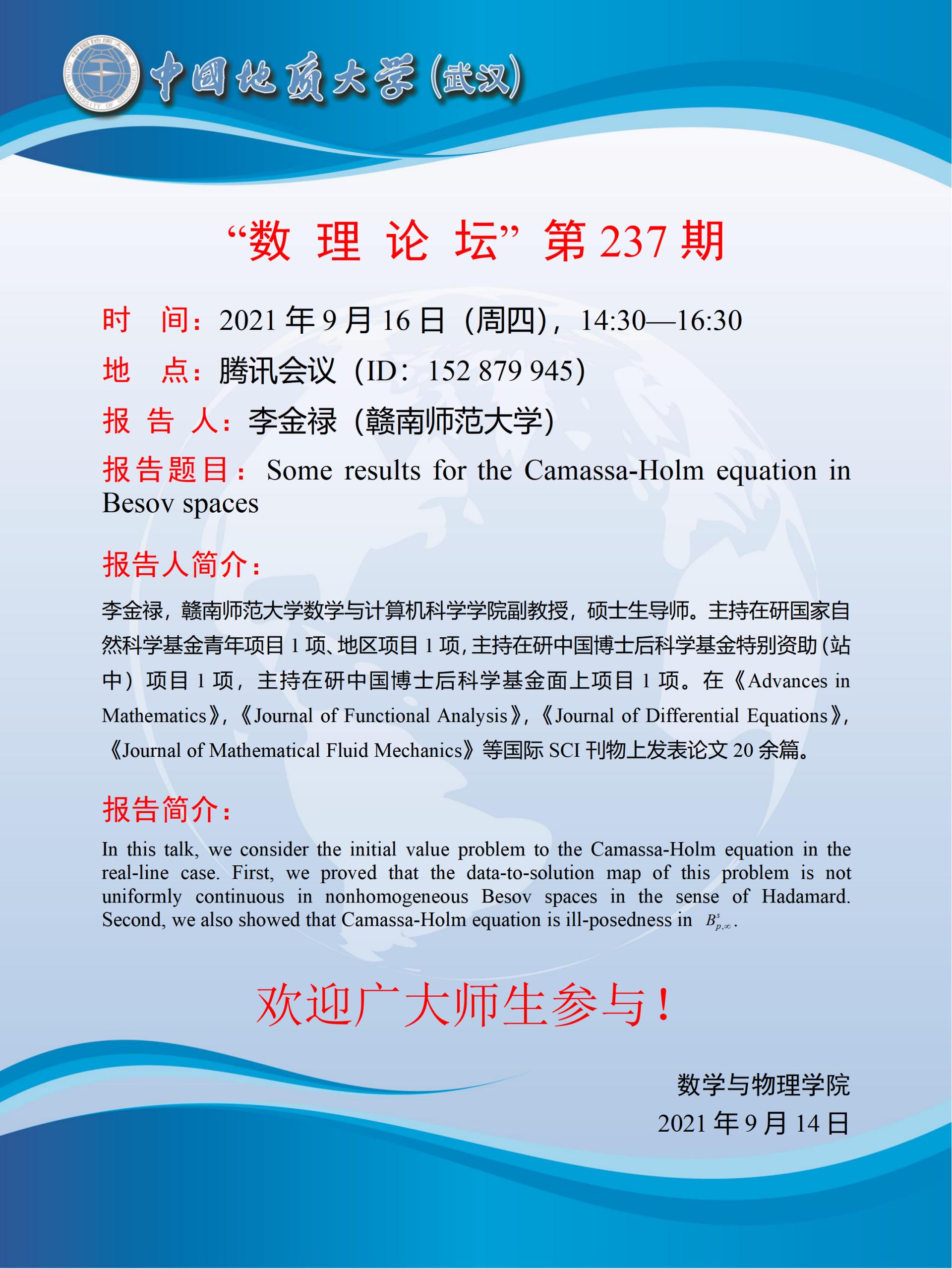 "数理论坛"第237期:Some results for the Camassa-Holm equation in Besov spaces