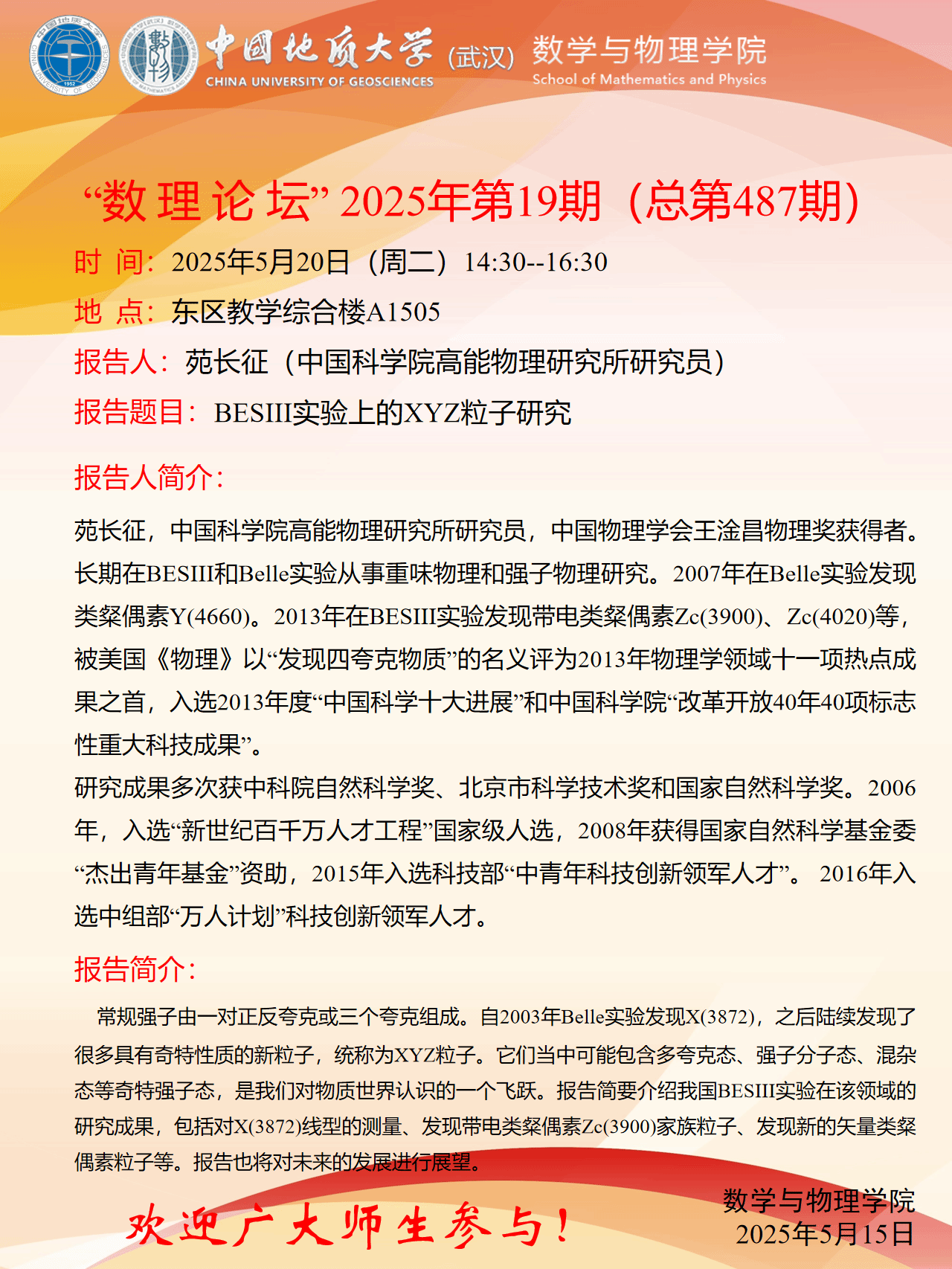 2025年5月20日苑长征研究院报告:BESIII实验上的XYZ粒子研究