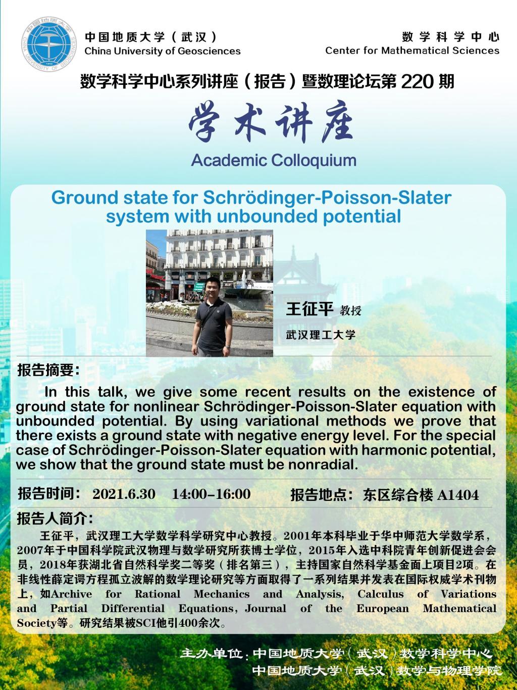 "数理论坛""第220期暨数学科学中心系列讲座(报告):Ground state for Schrödinger-Poisson-Slater system with unbounded potential